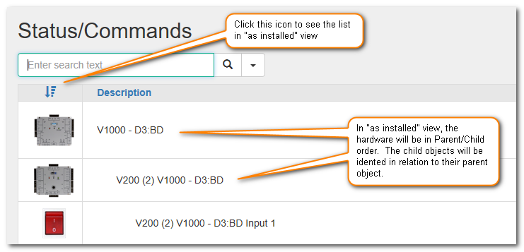 The Status/Commands page will list all the hardware in the current partition. By default the hardware is shown in alphabetical order by description.
